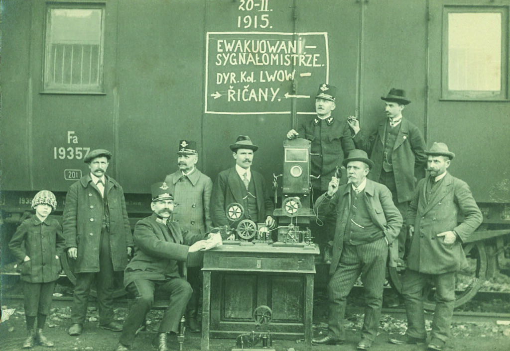Zajímavá sbírková fotografie má cosi společného s aktuální situací. Fotografie byla pořízena 20. února 1915 na říčanském nádraží a zachycuje skupinu zaměstnanců Rakouských státních drah. Ti byli evakuováni z Východní Haliče – jedné z korunních zemí tzv. Předlitavska, rozkládající se na území dnešního jihovýchodního Polska a západní Ukrajiny – před postupující ruskou armádou. Jak nás informuje polský nápis na vagónu (polština byla jedním z úředních jazyků Haliče), jedná se o návěstní mistry (sygnalomistrze) železničního ředitelství ve Lvově (Dyrekcja kolejowa Lwow). Tito návěstní mistři měli na starosti kromě obsluhy železničních návěstidel také telegrafní a telefonické spojení na železnici, na což upomínají vystavené telegrafy a telefon v popředí. Fotografie vznikla zjevně u příležitosti příjezdu do cílové destinace evakuace, jíž byly právě Říčany. Fotka je o to zajímavější, že o této skupině utečenců, kteří na nějaký čas nalezli v Říčanech útočiště, jinak nic nevíme. Další zajímavostí je, že snímek jaksi mimoděk připomíná, že před rokem 1918 příslušely Říčany a dnes západoukrajinský Lvov do jednoho a téhož státu a jejich obyvatelé tak byli v zcela doslovném smyslu spoluobčany.