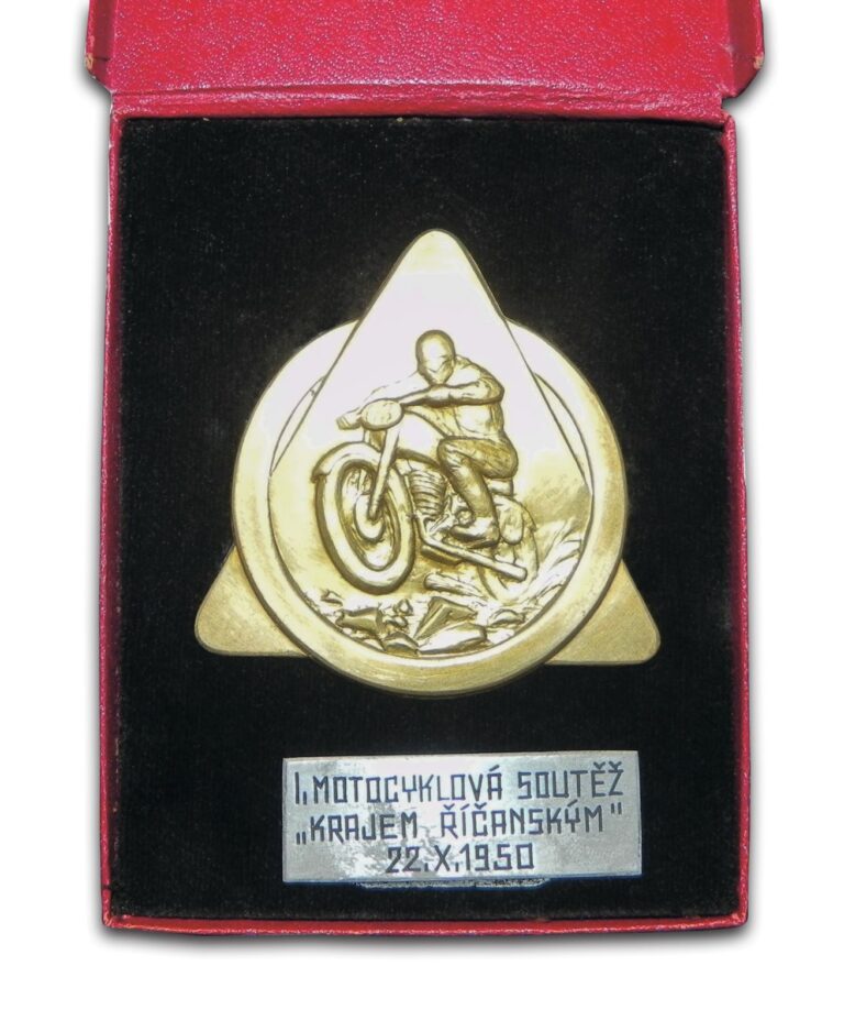 Plaketa k motocyklovému závodu v roce 1950. Muzeu ji věnoval Jan Vyhnálek nejstarší. Foto: archiv Muzea Říčany