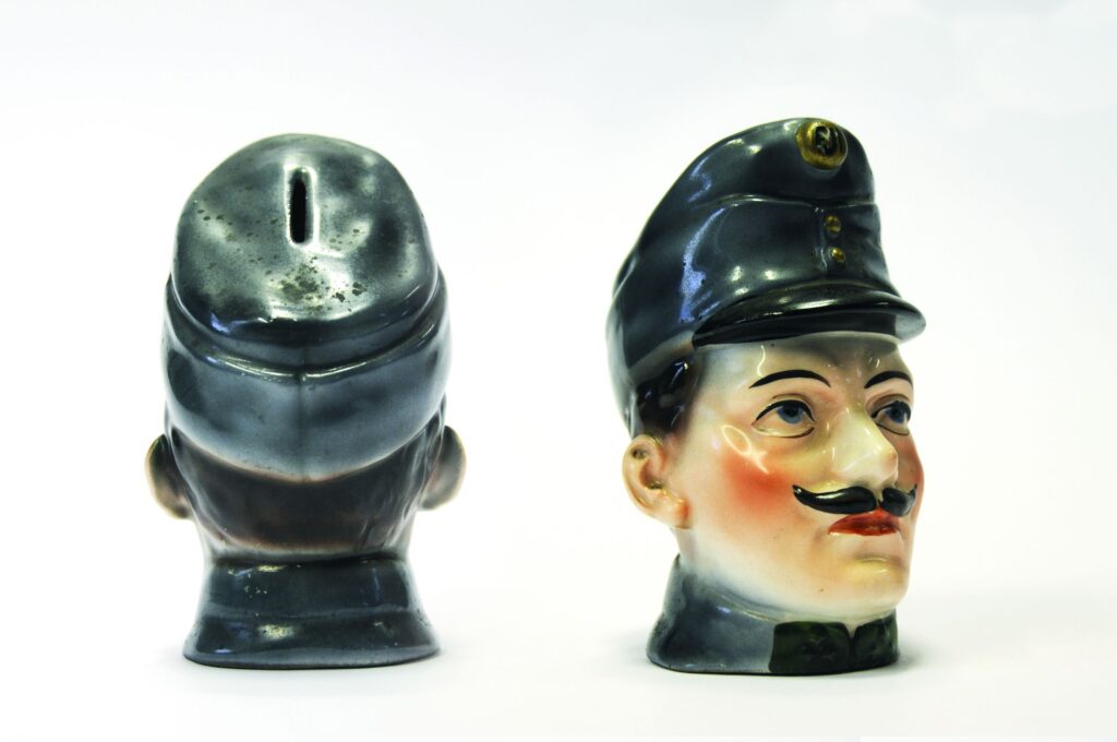 Podobně jako se dnes neobejde žádná velká akce bez „propagačních předmětů pořadatele“, v minulosti tomu nebylo jinak. Na zemských výstavách, sokolských sletech či při příležitosti panovníkova jubilea bylo možné zakoupit si rozličné obrázky, pohlednice, pamětní mince nebo hrnečky, upomínající na výjimečnou událost. Památeční předměty se ovšem vytvářely i během 1. světové války a ve sbírkách říčanského muzea se jich uchovalo několik desítek. Jedná se například o kýčovitě vyhlížející porcelánové kasičky v podobě rakousko-uherských vojáků (na obrázku), kasička v podobě pomníku s portréty císařů Františka Josefa I., Viléma a tureckého sultána Mehmeda V. nebo hrníčky s nápisem „Kriegserinnerung – Gott mit uns – 1914“ (Vzpomínka na válku – Bůh s námi – 1914). Památeční předměty ovšem vznikaly i na frontě (např. rozličné výrobky zajatců z dřeva, papíru a textilu, upravené nábojnice a hlavice šrapnelů) či za první republiky. Tehdy byli propagováni především příslušníci československého zahraničního vojska, tzv. legionáři. Kromě odznáčků upomínajících na legionářská vítězství (Zborov, Bachmač) se často prodávaly i krabičky uzavřené pečetí, obsahující prsť (hlínu) z bojišť. Krabičky s prstí z Doss Alto (Itálie) a Terronu (Francie) si společně s dalšími památkami na 1. světovou válku můžete do 20. prosince prohlédnout na výstavě „Tohle je válka 1914–1918“ v říčanském muzeu.