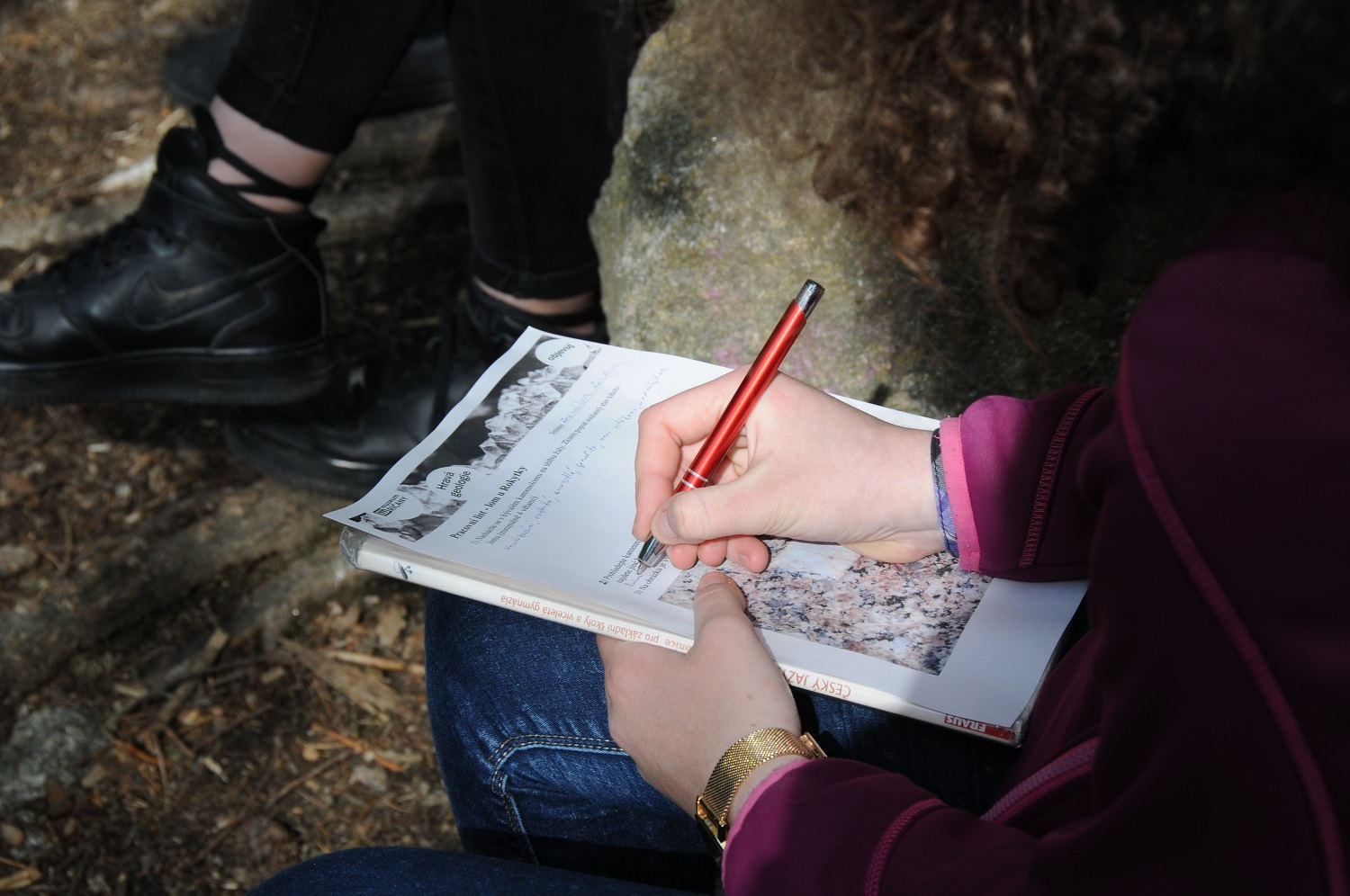 Lekce probíhá v lomu u Rokytky. Žáci ve skupinách zkoumají lom, pracují s geologickou mapou, geologickým kladívkem a pracovním listem.