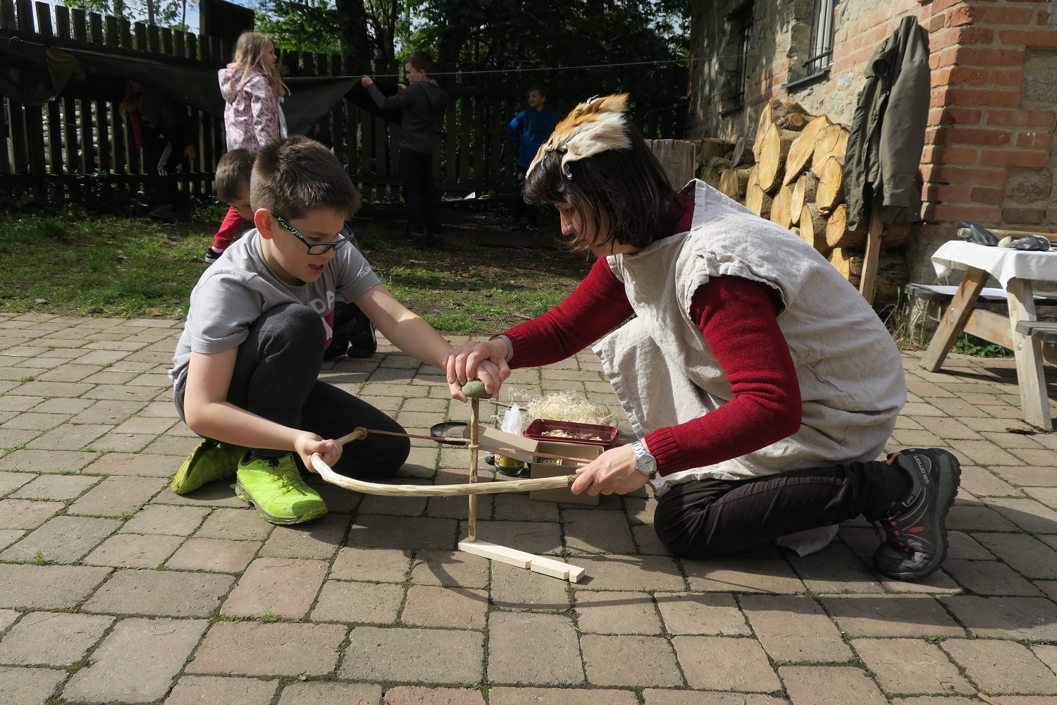 Žáci si vyzkouší práci s pazourkovými nástroji, rozdělávání ohně, zpracování obilí, tkaní a výrobu keramiky. Ocitají se nejdříve v době lovců a sběračů, kde se seznamují s významem vynálezu ohně, poté se z nich stávají pravěcí zemědělci.