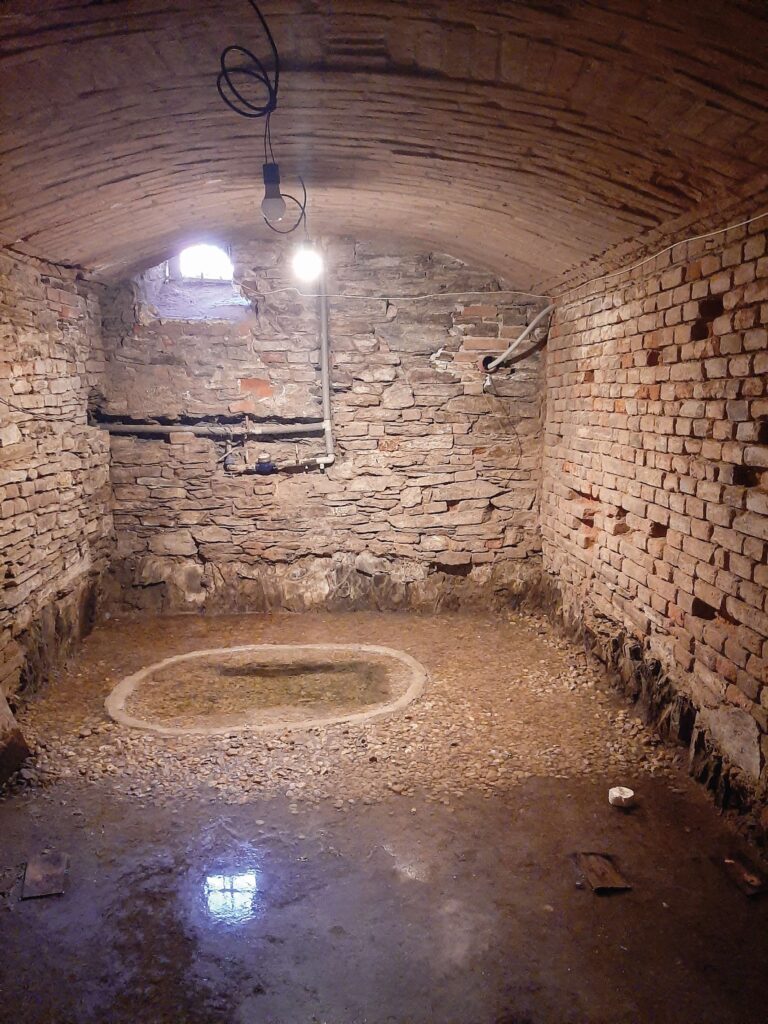 Podlaha sklepa je zatesána do rostlé skály. Nalevo mělká prohlubeň pro jímání podpovrchové vody Foto: Martin Škába a Muzeum Říčany