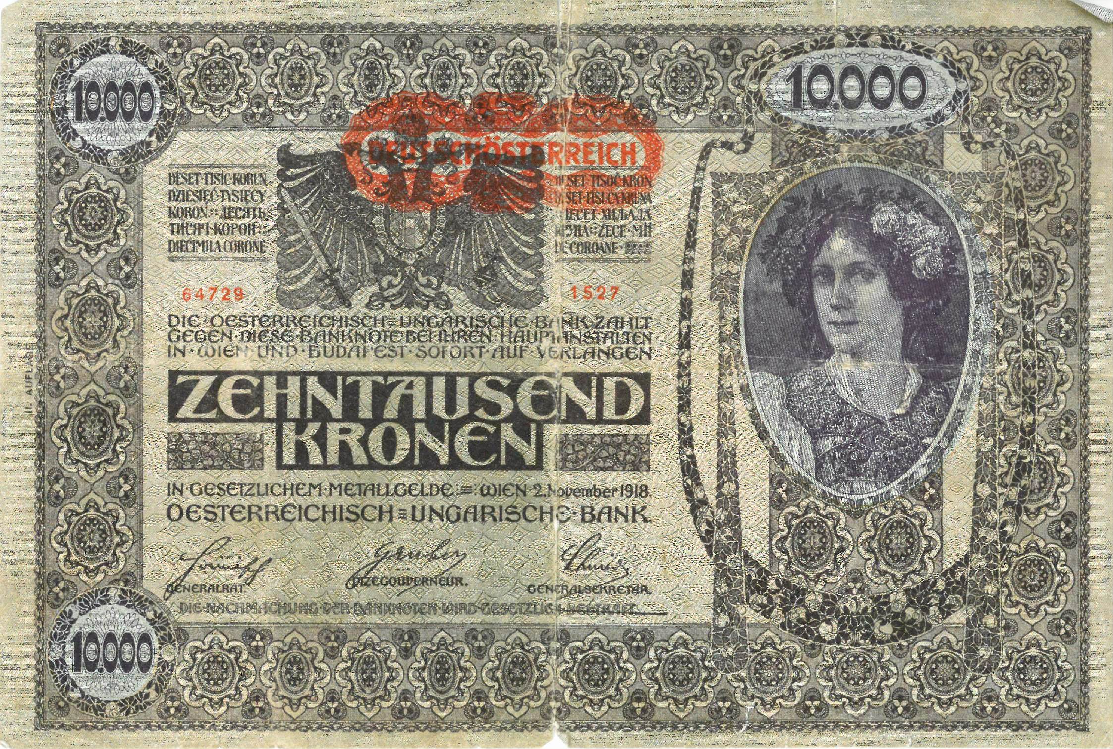 Ze sbírek muzea: desetitisícikorunová bankovka z roku 1918 Letos v srpnu tomu bylo 130 let, co platíme korunou. Během doby své platnosti zažila korunová měna