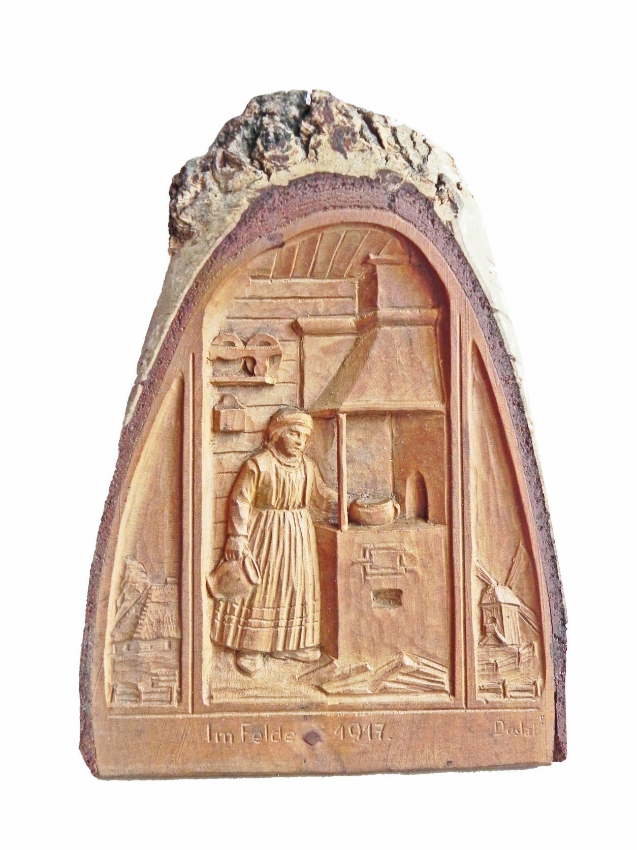 Představme si tentokrát jeden svérázný artefakt vzniklý přímo na frontě první světové války. Jde o reliéf vyřezaný na desce z březového dřeva, šikmo vyříznuté z kmene.
